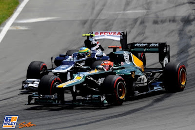 | Bruno Senna (atrás de Heikki Kovalainen) fez uma corrida bem discreta e se manteve na pista até o final |